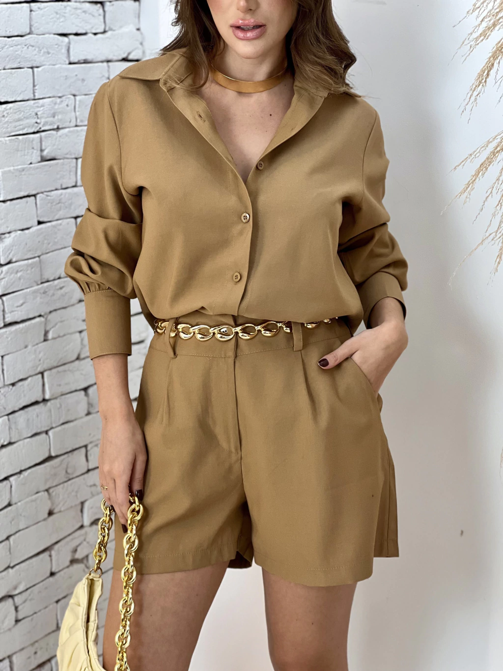O short, por sua vez, conta com um fechamento seguro por botão e zíper, garantindo um ajuste confortável. A combinação da camisa e do short permite criar um look harmonioso e de fácil coordenação, perfeito para o dia a dia.