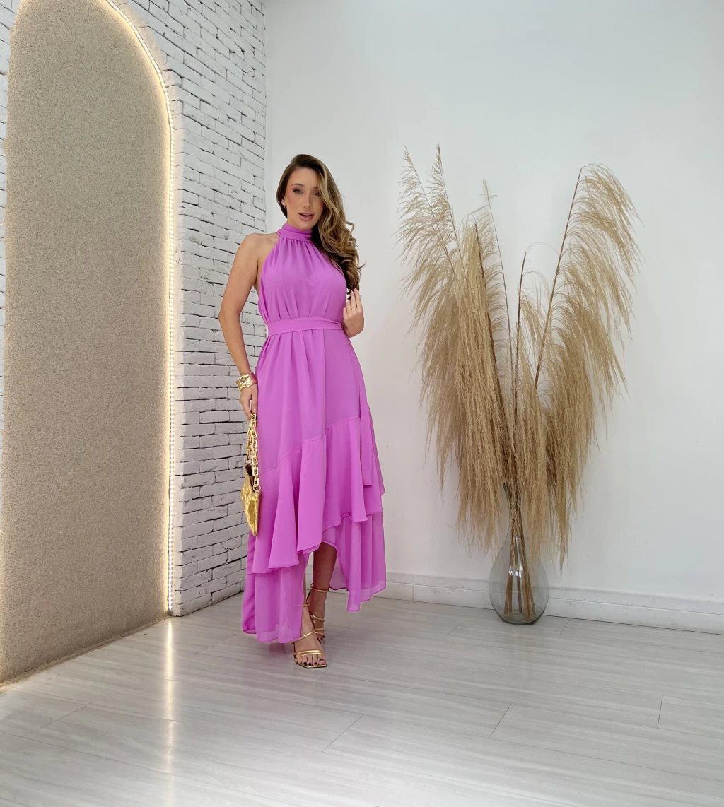 Confeccionado em chiffon, um tecido leve e fluido, este vestido oferece um movimento lindo a cada passo, garantindo um caimento impecável no corpo. Sua modelagem regata com gola alta traz um charme extra para a produção, enquanto a faixa para amarração no pescoço valoriza ainda mais o visual.