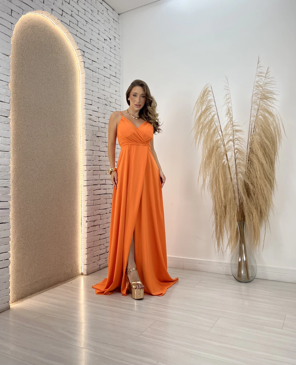 Elegante e sofisticado, o Vestido Longo Com Fenda é a escolha perfeita para ocasiões especiais como casamentos e formaturas. Confeccionado tecido crepe levemente acetinado, ele proporciona um caimento incrível e conforto durante todo o evento.